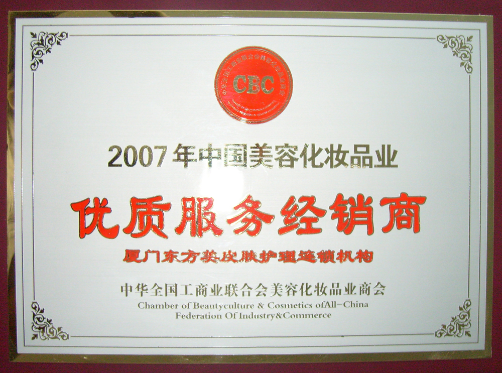 »2007年,东方美被评为中国美容化妆品业“优质服务经销商”